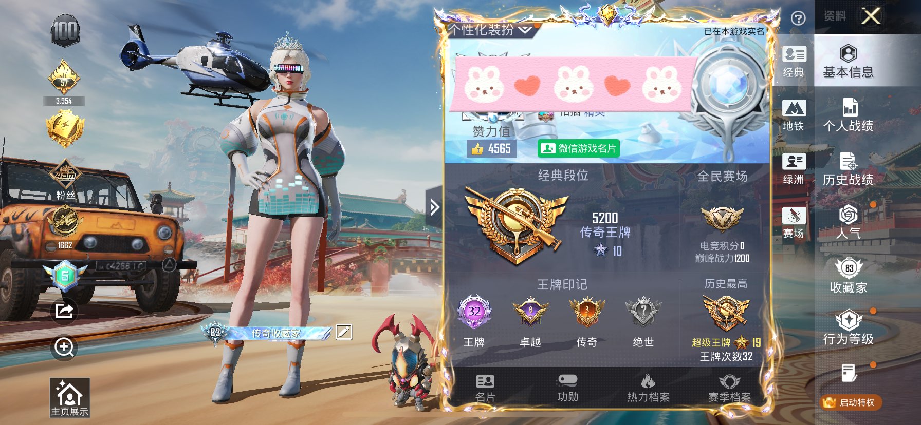 适配系统:苹果 特效枪数量:999 出租次数限制:1 账号类型(腾讯):微信 载具数量:99 分销起租时长:2 套装数量:999 粉色时装数:999 枪皮数量:999